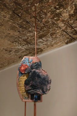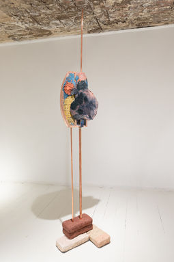 La instalación que ahora presenta Macarena consiste en un conjunto de esculturas que dejan ver sus fallas y grietas por las que se asoma la materialidad interna de la obra. Estas presencias se prolongan en especies de antenas neuronales que comunican el suelo con el cielo, evocando la posibilidad de transitar entre distintos niveles de la materia, la emoción y el pensamiento.